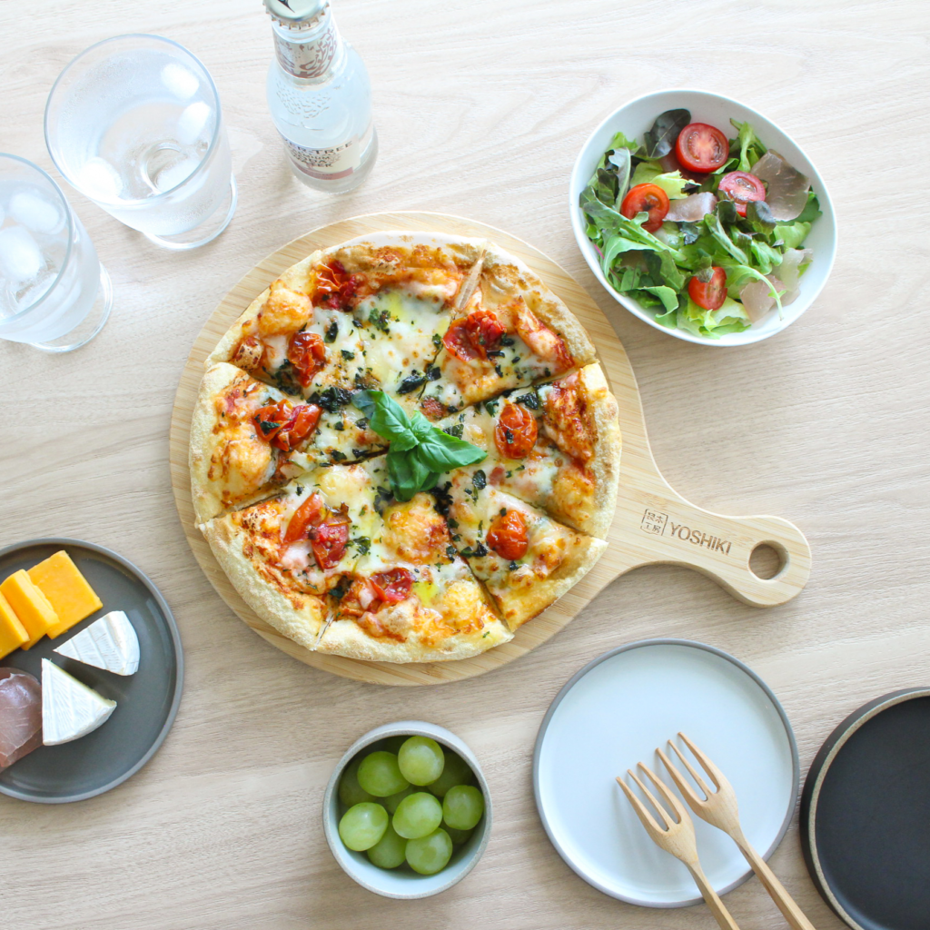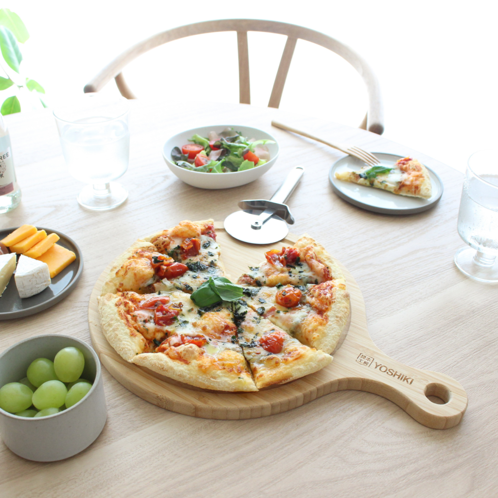 ピザやパンはもちろん、果物やお肉など水気があるものでも溝があり、汁が垂れる心配がありません。また、カッティングボードとしても活用できます。