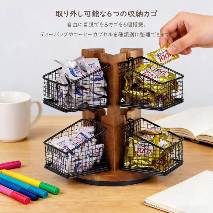 360度スムーズに回転するスタンドとオープンデザインを採用。蓋を開ける手間がなく、ティーバッグをひと目で見つけてサッと取り出せます。ご自宅に、居心地のよいお茶やコーヒーのコーナーを気軽に作る
